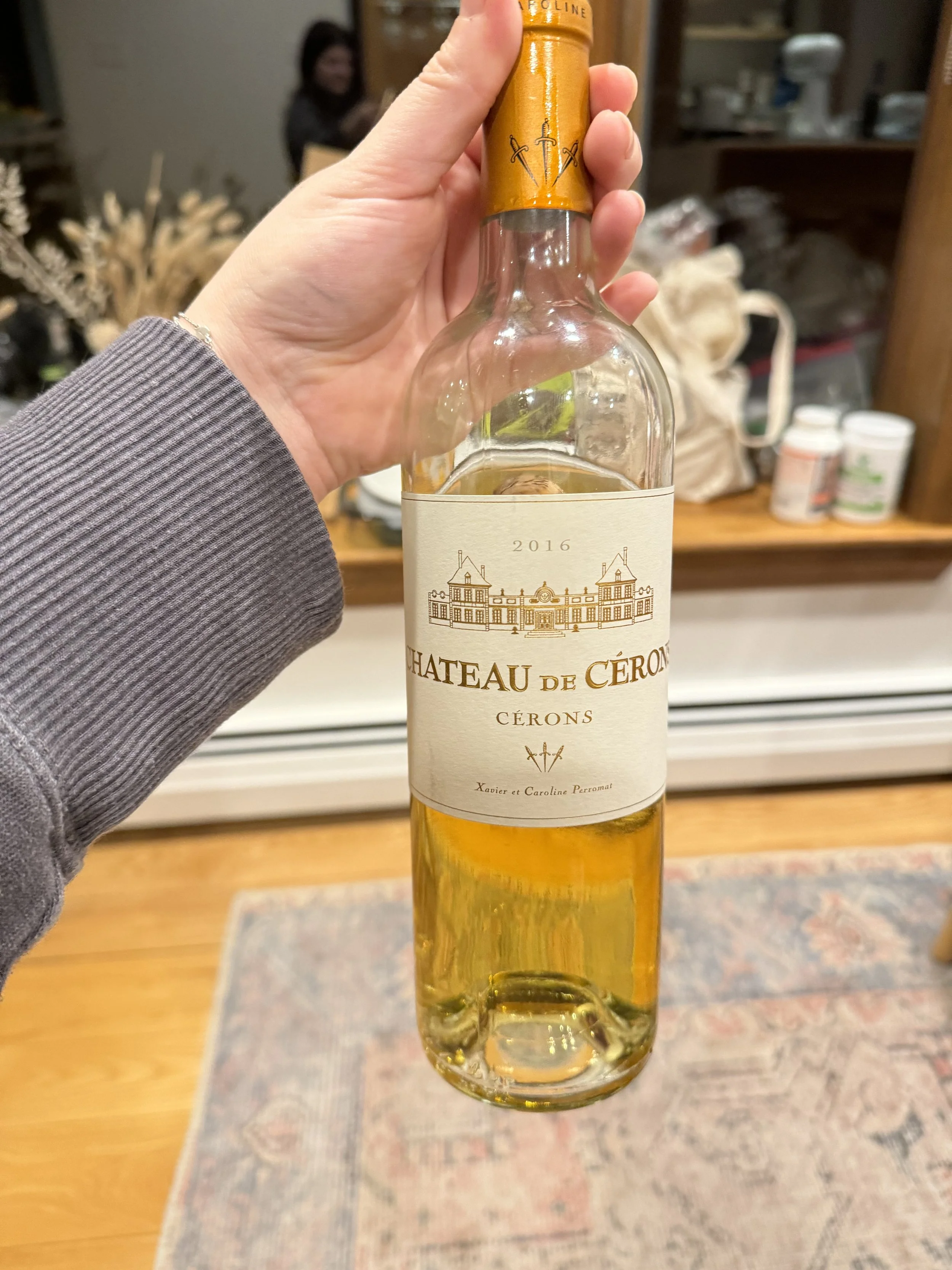 We actually bought this wine in Bordeaux back in May because at our wine class, the teacher told us this sweet wine was always enjoyed on New Years and Christmas with foie gras and we did exactly that. It is very very sweet and cut the richness of the liver quite nicely.