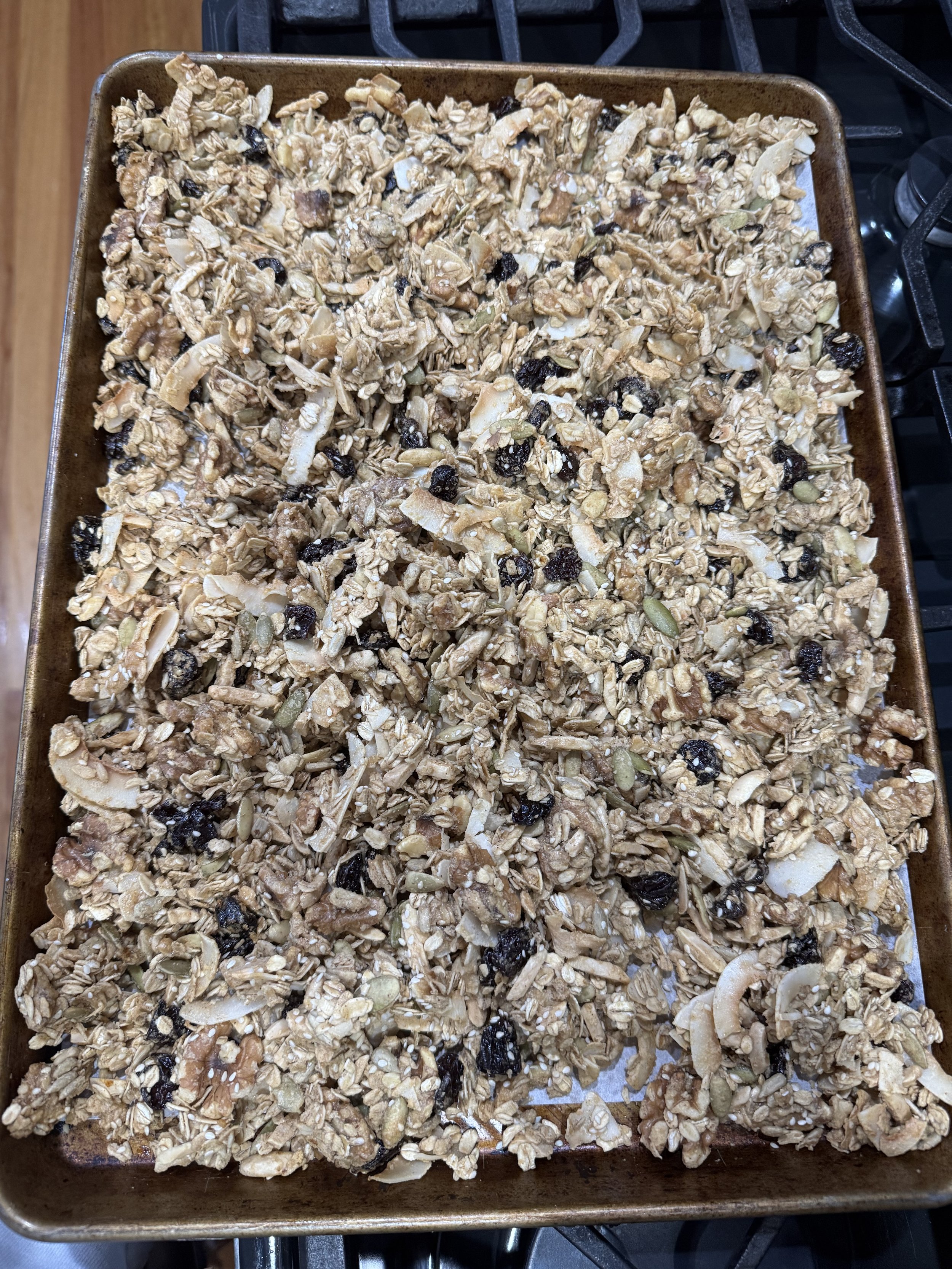 Allow the granola to cool completely on the baking sheets, then transfer it to an airtight container for storage.